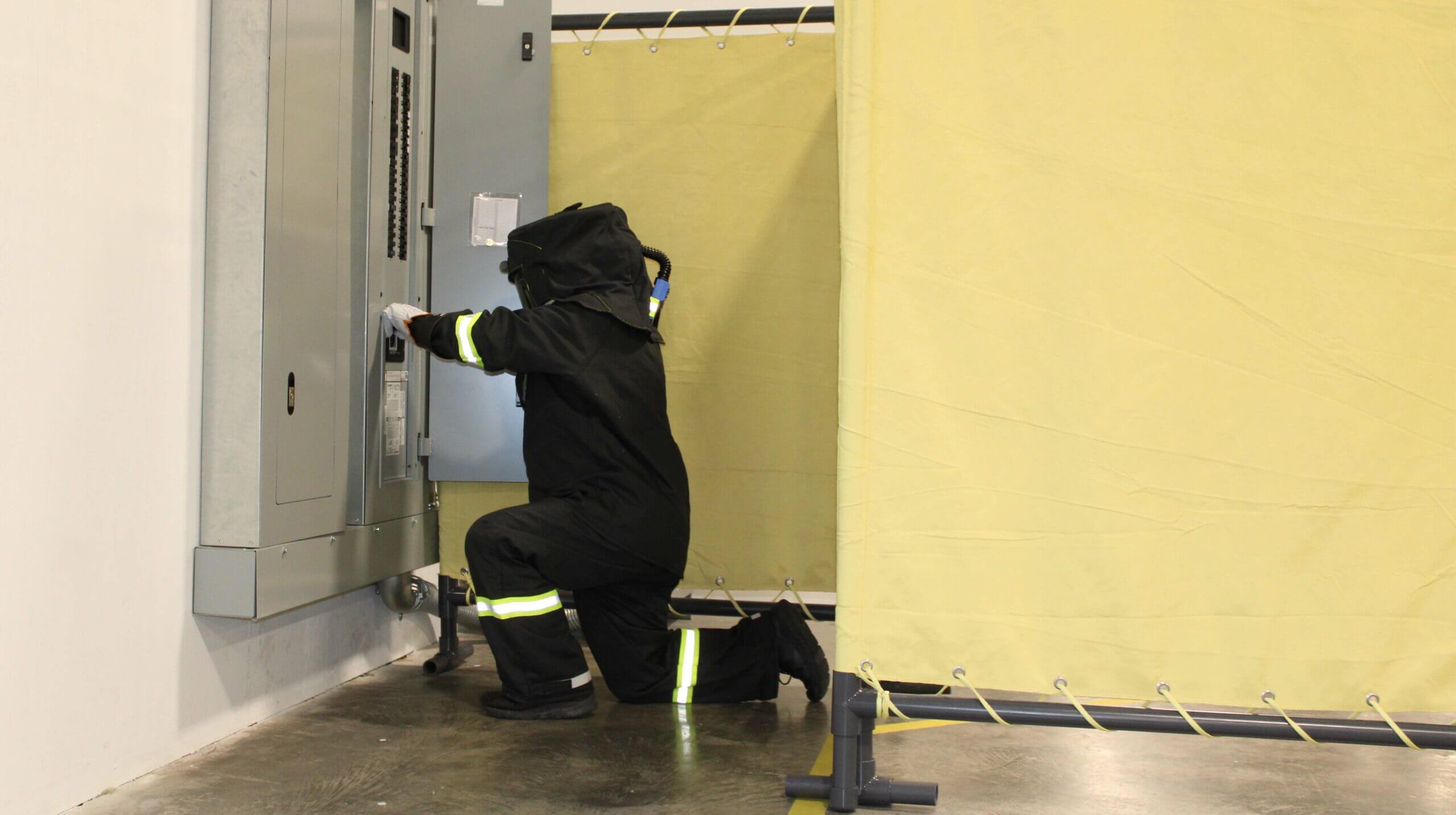 The Arc Flash Curtain Cube can be set up in various positions to protect around a work space.
